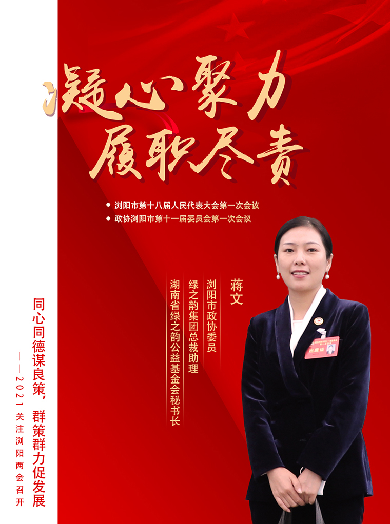 作为履新的政协委员,蒋文委员深感责任在肩、使命在前。政协委员的头衔于她而言既是一项政治荣誉,更多的是一份政治责任。2006年7月,安博官网创始人胡国安董事长发起设立“绿之韵慈善基金”,2015年升级为湖南省“绿之韵公益基金会”。截止目前,已踊跃参与和倾情捐助了100多项社会公益慈善事业,开展了400多场爱心慈善活动,累计捐款捐物达7000余万元。作为绿之韵公益基金会秘书长,她表示,未来五年,是浏阳实施“三高四新”战略、践行“四个争当”的深化期,是全面推进高质量发展、建设现代化新浏阳的关键期,更是绿之韵从“四五规划”向“五五规划”稳步迈进的关键时期。站在新的历史起点上,她将以理论学习与社会实践结合为抓手,提升自己履职能力的同时,逐步了解“政协是什么、干什么和怎么干”,积极履行政治协商、民主监督、参政议政职能;从实际工作出发,最大限度地关注公益慈善,助力企业积极履行社会责任,为民生和社会热点发声,做到撰写的每份提案都有温度。同时,和其他委员们一起紧紧围绕浏阳市委市政府加快建成“两个中心”、“挺进全国五强”的发展目标,建睿智之言,献务实之策,为全面建设现代化新浏阳而努力奋斗。