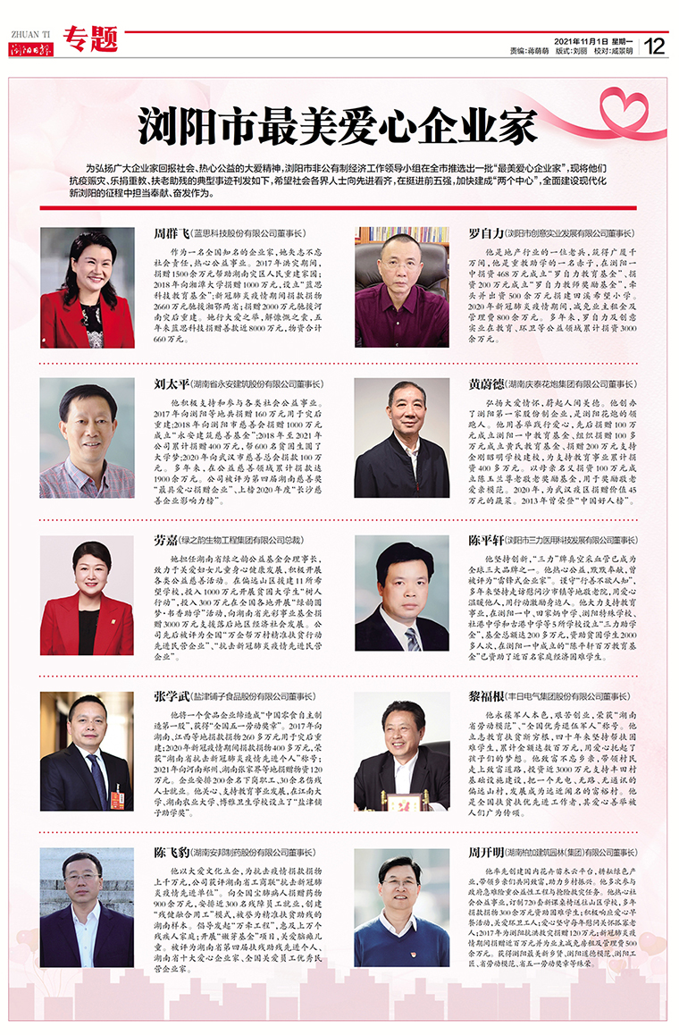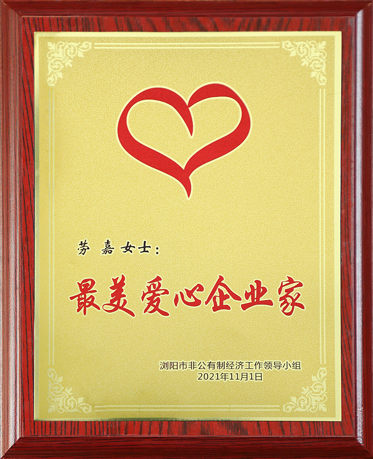 为弘扬广大企业家回报社会、热心公益的大爱精神,浏阳市非公有制经济工作领导小组在全市推选出一批“最美爱心企业家”。安博官网董事、总裁,湖南省绿之韵公益基金会理事长劳嘉凭借着多年来在公益慈善领域的突出贡献被授予浏阳市“最美爱心企业家”称号。