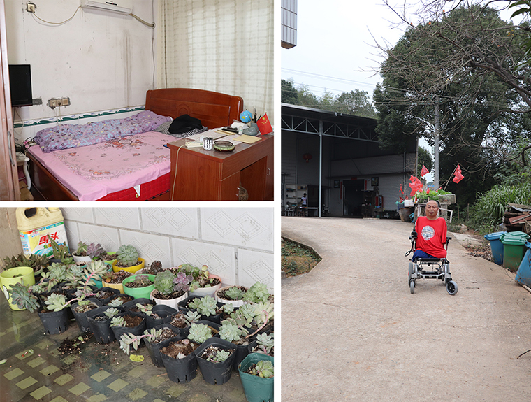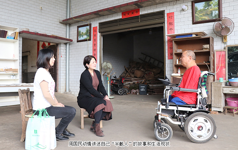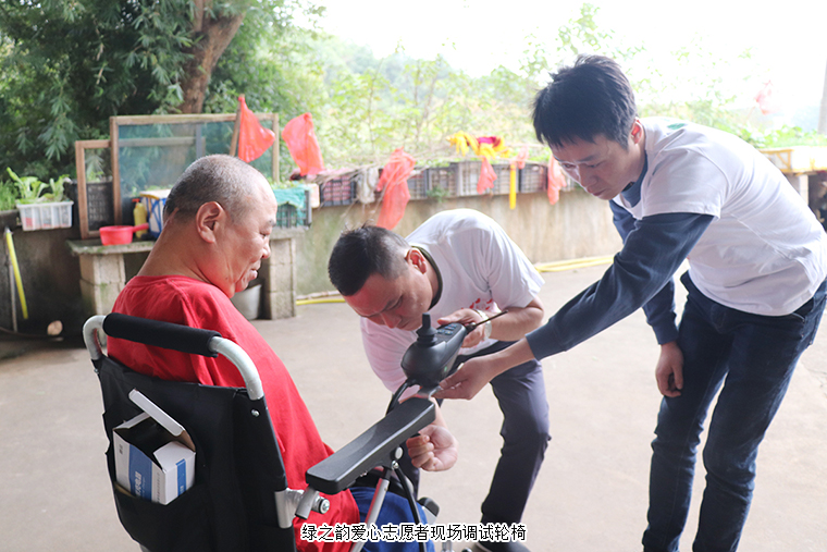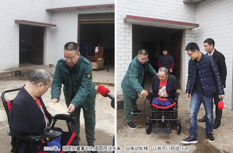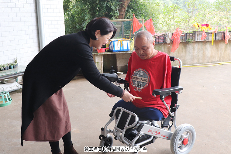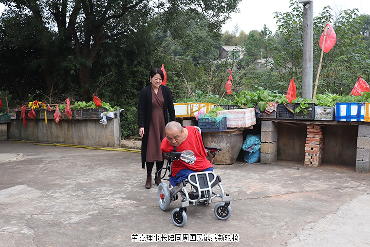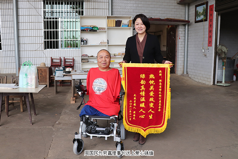 轮椅就是日日夜夜陪伴周国民的“老伙计”,这几年风里来雨里去,经过了补胎、换电瓶等各种维修,原来这台轮椅也终是要“退休”了。因为劳嘉理事长送来的新轮椅,他无法用言语来表达内心的感动。每年,绿之韵公益基金会志愿者都会去看望他,送上慰问金,还为方便他们家人的生活,添置了电饭煲、电磁炉和微波炉等家用电器。他几次找到基金会,拜托工作人员为他做一面锦旗,他希望尽可能表达出内心的感恩。劳嘉理事长陪着他试乘新轮椅,周国民也不住地感谢:“家人的支撑让我熬过了生命的最灰暗,世间的爱心让我感受到人生不受限,处处有希望。感谢胡总和劳总,感谢绿之韵,希望好人一生平安。”