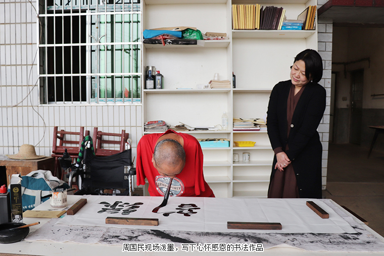 离开前,周国民在劳嘉理事长帮助下挥毫泼墨,写下了《绿韵大爱》的书法作品。挥洒的汗水、真诚的笑容、动人的身影就如这秋日暖阳,在寒冷季节到来之前尤为珍贵。我们希望,命运夺走了他的部分躯体,爱让他的人生不再残缺。