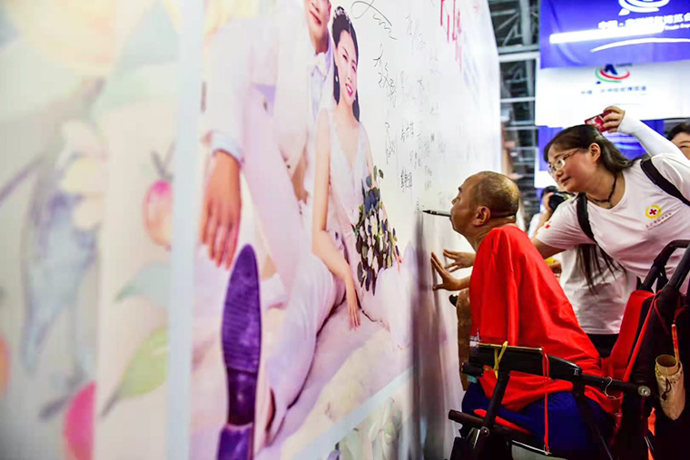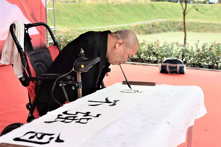 康复过程的煎熬与苦痛,现在的他已经可以平静叙述。6年中大大小小手术进行康复治疗,重新坐起来;3年时间不断练习和自理,学会用口含笔写书法,重新建立人生信心;10年后,他定下了新的人生目标,不仅要照顾好自己和家人,还希望可以帮助到跟他一样有需求的残疾人。