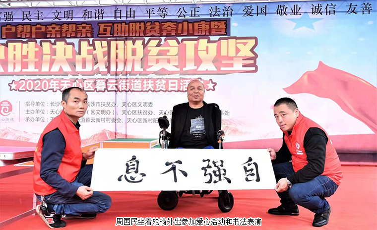 有了电动轮椅,周国民可以自由行动,也发现了更多人生可能。他参加了无数次慈善义卖和书法活动,展示他用嘴书写和画画的才艺,影响了更多像他一样身残志坚、克服生活困难的人们。2020年新冠疫情发生,周国民不能经常外出,于是和好友徐国强一起合伙开了一个养殖场,养了2000余只鸭子。他负责销售,徐国强负责喂养和送货。虽然一年下来,只有2万多元收入,但对于他来说已经是很大的突破。天助自助者,当自己有生存能力了,才能安身立命,才能为家人分担解忧,甚至回馈社会的爱心与温暖。这是周国民一直特别坚强的信念。