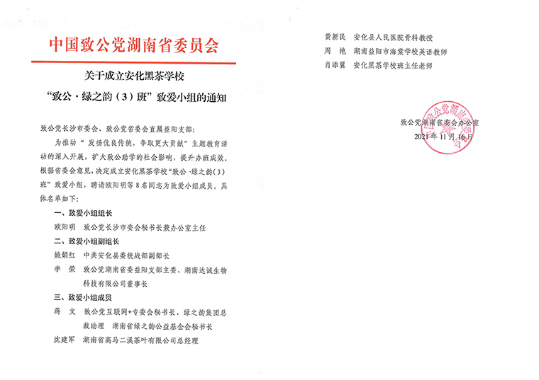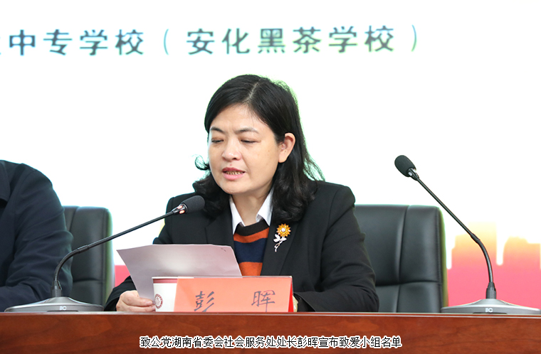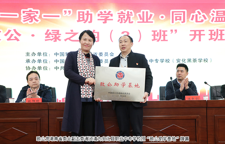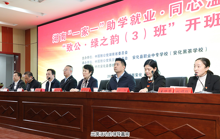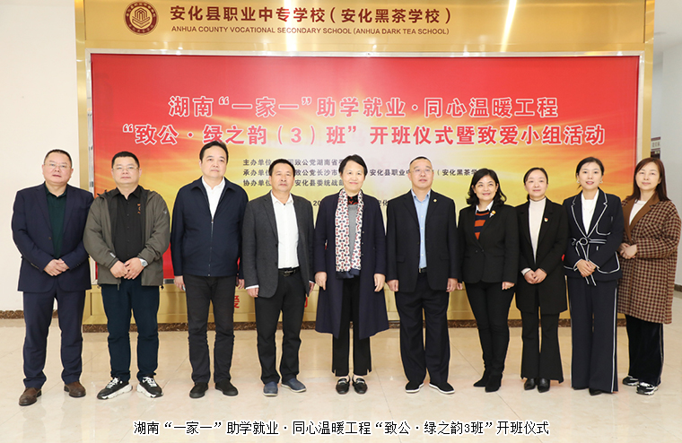 2021年11月16日,湖南“一家一”助学就业·同心温暖工程“致公·绿之韵3班”开班仪式暨致爱小组活动在安化县职业中专学校(安化县黑茶学校)举行。全国人大代表、致公党湖南省委会副主委、湖南师范大学副校长谢资清,致公党湖南省委会社会服务处处长彭晖,致公党长沙市委会秘书长兼办公室主任欧阳明等出席活动,中共安化县委副书记、统战部部长潘文剑,中共安化县委统战部副部长姚娟红,安化县教育局党组成员、副局长刘胜辉,湖南省政协委员、致公党湖南省委会互联网+专委会名誉主任、安博官网董事长胡国安,浏阳市政协委员、致公党湖南省委会互联网+专委会秘书长、绿之韵公益基金会秘书长蒋文等参加开班仪式。安化县职业中专学校(安化县黑茶学校)党总支书记、校长刘迪凡带领学校领导班子成员、部分教师和学生代表参加活动。