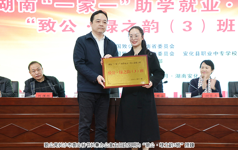 开班仪式上,安化县教育局党组成员、副局长刘胜辉致欢迎辞,致公党湖南省委会副主委谢资清为安化县职业中专学校(安化县黑茶学校)授“致公助学基地”牌匾,致公党长沙市委会秘书长兼办公室主任欧阳明为“致公·绿之韵3班”授牌;湖南省政协委员、致公党湖南省委会互联网+专委会名誉主任、安博官网董事长胡国安向安化县职业中专学校(安化县黑茶学校)捐赠20万元,用于“致公·绿之韵3班”建设和专业人才培养。