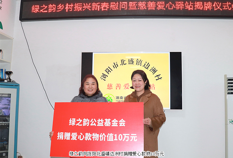 春节慰问送温暖,暖冬关爱显真情。2022年1月13日,绿之韵乡村振兴建设暨新春慰问活动走进浏阳北盛镇边洲村。绿之韵再次向边洲村捐赠10万元爱心款物,主要用于边洲村乡村振兴建设和困难群众新春慰问等,并与村委共建慈善爱心驿站,希望影响更多的爱心企业和人士来到爱心驿站奉献爱心,输送温暖。