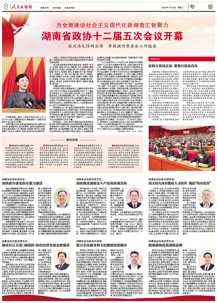 16日下午2时30分,贺安杰宣布大会开幕,全体起立,奏唱国歌。报告全面回顾总结了十二届省政协常委会2021年的主要工作成绩。2021年是党和国家历史上具有里程碑意义的一年。中国共产党走过了百年风雨历程,在中华大地上全面建成小康社会,百年目标、千年梦想终成现实。新一届中共湖南省委站在新的历史起点上,团结带领三湘儿女,意气风发行进在全面建设社会主义现代化的新征程上。这一年,省政协常委会坚持以习近平新时代中国特色社会主义思想为指引,在中共湖南省委的坚强领导下,从党的百年奋斗伟大成就和历史经验中汲取奋进力量、践行初心使命,不断加强专门协商机构建设,努力以“政协之能”服务“湖南之为”,为我省经济社会发展贡献了政协力量。会议指出,我们要高举习近平新时代中国特色社会主义思想伟大旗帜,深入学习贯彻中共十九大和十九届历次全会精神,学习贯彻习近平总书记对湖南重要讲话重要指示批示精神,聚焦省第十二次党代会重大决策部署,深入开展“汇智聚力助推高质量发展”主题活动,做好建言资政和凝聚共识工作,以高水平履职服务高质量发展,为全面建设社会主义现代化新湖南汇众智、聚众力,以优异成绩迎接中共二十大胜利召开。要更加忠诚拥护“两个确立”、坚决做到“两个维护”;更加有效服务高质量发展;更加用心助推解决群众急难愁盼问题;更加广泛凝心聚力;更加有力提升政协工作实效。会议号召,让我们更加紧密团结在以习近平同志为核心的中共中央周围,在中共湖南省委的坚强领导下,始终保持“闯”的精神、“创”的劲头、“干”的作风,团结一心、勇毅前行,为全面建设社会主义现代化新湖南而努力奋斗,以优异成绩迎接中共二十大胜利召开!