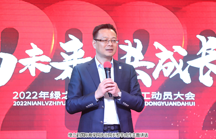 绿之韵国际商学院执行院长黎芋成作主题讲话。他从专业、专心、专注、专一多个角度向大家阐述了梦想和成长的意义。他预祝所有绿之韵人都能够在接下来的一年里拥有更好的未来,都能一起不断收获成长。最后,他改编了电影《奇迹笨小孩》中的一句台词鼓励大家:致敬当下,每一个奋斗的绿之韵人,我们每个人都是奇迹的创造者。