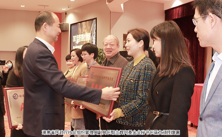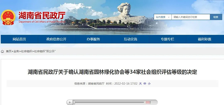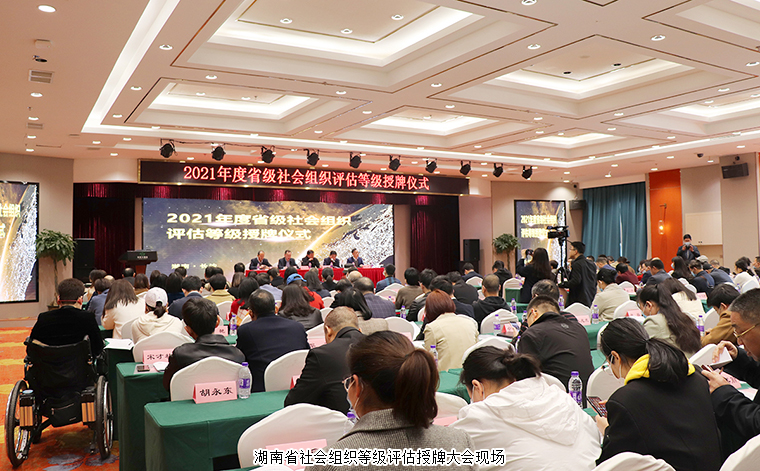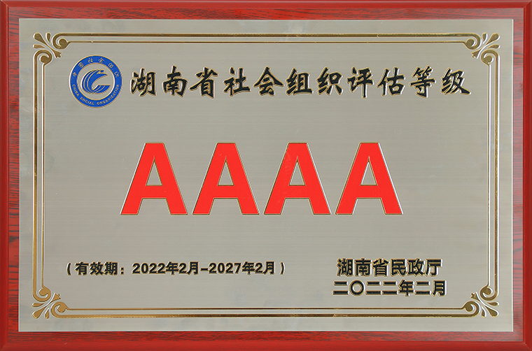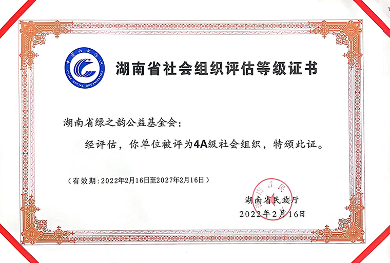 2022年3月9日,湖南省社会组织等级评估授牌大会在长沙召开。根据民政部《社会组织评估管理办法》、《湖南省社会组织评估管理办法》有关规定,社会组织等级评估从基础条件、内部治理、工作绩效、党建工作和社会评价五个方面对申报单位进行综合考评,经专家组实地考察、现场交流、意见反馈、资料核查、网上公示等程序,最终确定评估等级。湖南省绿之韵公益基金会获评“4A级社会组织”。