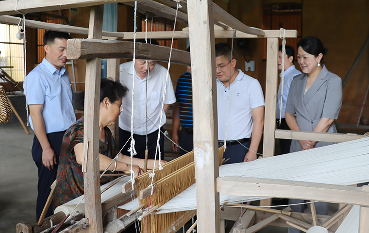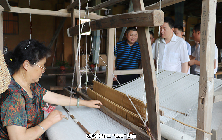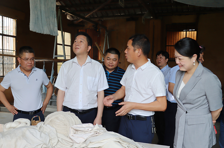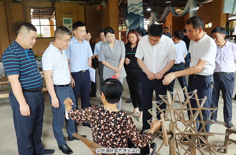 调研组一行首先来到卓然原乡染坊就非遗传承保护、文旅融合发展等工作进行考察,深入了解了原乡染坊目前的经营情况。原乡染坊作为北盛镇捞刀河畔·田园综合体项目的旅游休闲项目,其织布、染色都是采用“古法”操作,即纺织女工们用木制纺车纺出一匹匹夏布后,染色师傅们再用从卓然村收购的荷花、荷叶、莲蓬以及其他植物中提炼的染料给布匹着色。目前,染坊兼具生产、研学、文创三大功能,同时围绕染坊延伸建造生态染织物种植基地、织染学院、织染博物馆等文化新生态。