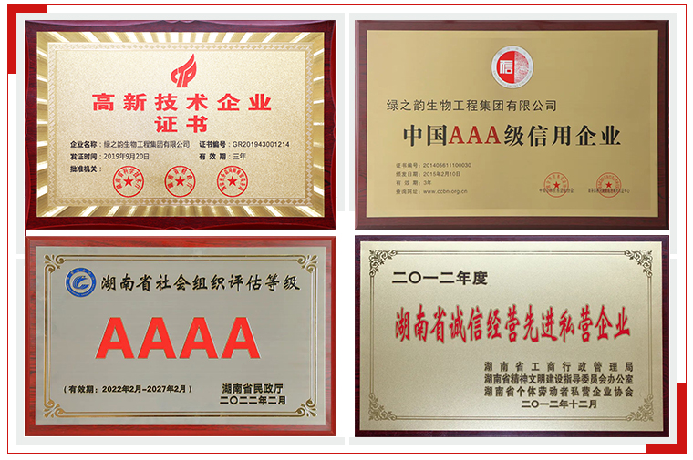 “和诚立信,竞超兴业”是绿之韵始终秉承的经营宗旨。自创立以来,公司坚持以规范为根本、以责任为使命、以品质为生命,立足健康可持续发展,维护消费者合法权益,传递行业正能量,不仅在企业品牌、战略、管理、文化等方面实现了大幅度提升,而且还不遗余力地为行业培养了许多行业精英人才,为民族品牌的良性发展与崛起贡献了自己的力量。公司连续十多年被授予“湖南省守合同重信用企业”,连续多年被授予纳税信用A级荣誉,先后获评“国家高新技术企业”“中国企业诚信经营示范单位”“中国AAA级信用企业”“湖南省诚信经营先进私营企业”“等殊荣。