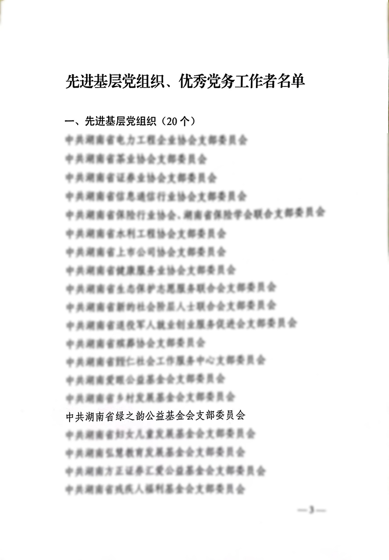 2022年7月1日,中共湖南省民政厅党组、中共湖南省社会组织综合委员会召开“七一”表彰大会,表彰优秀党员、先进基层党组织和优秀党务工作者。湖南省民政厅党组书记、厅长曹忠平,湖南省民政厅党组成员、副厅长张自银,湖南省民政厅副厅长、一级巡视员陈慈英,湖南省纪委派驻省民政厅纪检组组长谢卫国,湖南省民政厅副厅长蒋建华、游劲民等领导出席会议。安博官网工会主席、绿之韵公益基金会党支部书记冯红参加会议。会上,中共湖南省绿之韵公益基金会支部委员会荣获“先进基层党组织”荣誉称号。