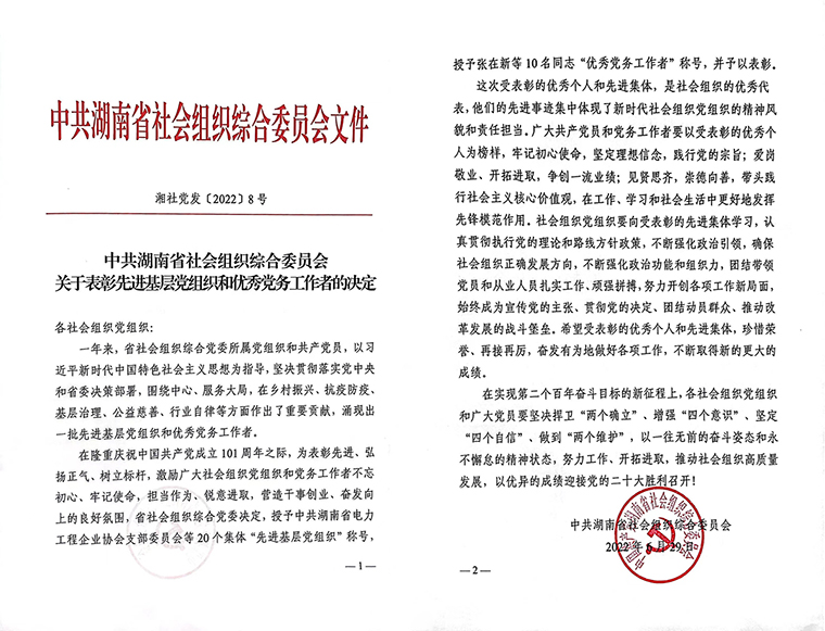 在隆重庆祝中国共产党成立101周年之际,中共湖南省社会组织综合委员会对20个优秀先进基层党组织、10位优秀党务工作者、43名优秀共产党员进行表彰。绿之韵公益基金会党支部在省社会组织综合党委、绿之韵党委领导下,以党建促特色,以创新求发展,充分发挥党组织的战斗堡垒作用和党员的先锋模范作用。打造学习型党支部,每月安排一次集体学习和研讨交流,全年开展了20余次组织和主题学习工作;大胆探索“党委+公益基金会+工会”社会扶贫新模式,开展关爱困难女性、绿之韵希望学校、儿童关爱、致公助学、乡村振兴建设等30个品牌公益项目,2021年,在乡村振兴专项工作中捐款200余万元,连续获得省市工商联“抗击新冠肺炎疫情先进单位”荣誉。在此次“七一”表彰大会上被授予“先进基层党组织”荣誉称号。