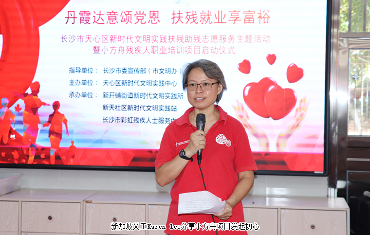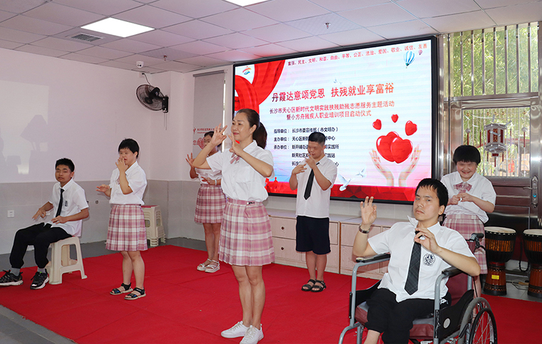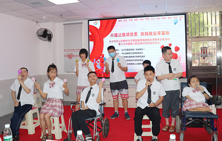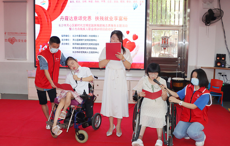 2022年7月14日,长沙市天心区新时代文明实践扶残助残志愿服务主题活动暨小方舟残疾人职业培训项目启动仪式举行。天心区委宣传部副部长、区文明办主任李贵勇,天心区文明办副主任龚细梅,长沙市慈善总会项目办主任朱佳,新开铺街道工委委员、组宣委员薛宏超,新开铺街道人大工委副主任陈娜,绿之韵公益基金会秘书长蒋文等受邀参加活动。