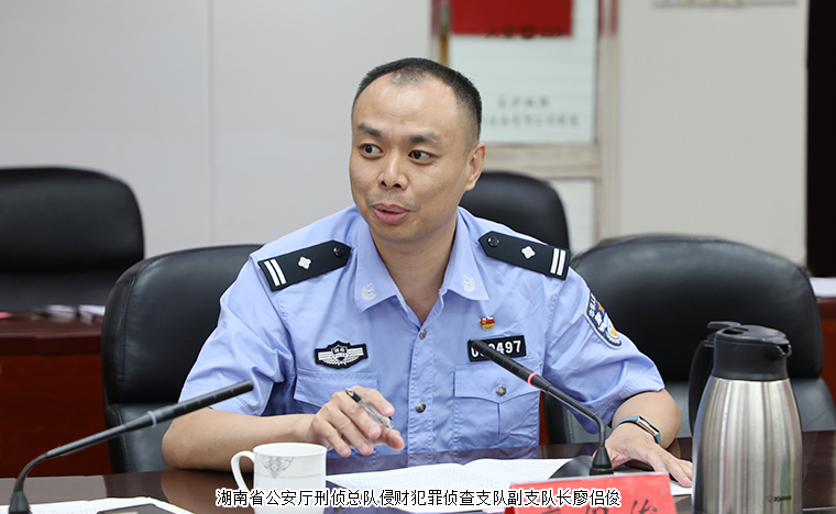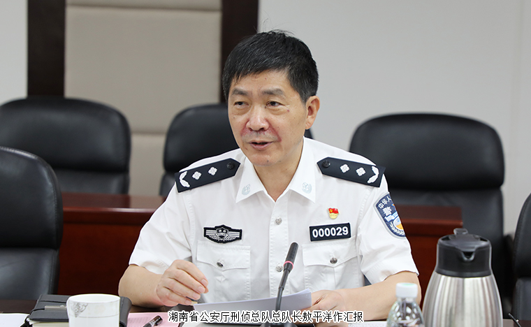 湖南省公安厅刑侦总队总队长敖平洋向调研组一行详细汇报了湖南省打击治理电信网络诈骗犯罪工作的相关情况:围绕总体目标,全面加强组织领导;狠抓“五个专项”,全面强化重拳出击;盯住“两个战场”,全面管控重点人员;聚焦“三大行业”,全面深化监管治理;筑牢“三条防线”,全面织密反诈网络。他表示,去年以来,我省打击治理工作取得了阶段性成效,但仍面临着新型犯罪成为主流犯罪形态,诈骗手法加速迭代、攻防对抗加剧升级,跨国有组织特征突出等重大考验。未来,湖南省公安厅将继续以贯彻落实中办、国办《关于加强打击治理电信网络诈骗违法犯罪工作的意见》和省委省政府《责任制规定》为抓手,全面加强综合治理、源头治理、推进齐抓共管、群防群治、坚决遏制电信网络诈骗犯罪高发态势。