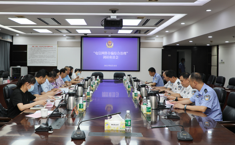 为贯彻落实中共中央办公厅、国务院办公厅《关于加强打击治理电信网络诈骗违法犯罪工作的意见》精神,2022年8月18日,致公党湖南省委会联合湖南工商大学赴湖南省公安厅开展“电信网络诈骗综合治理”课题调研。湖南省公安厅党委委员、副厅长李介德,省公安厅刑侦总队总队长敖平洋,省公安厅警令部副主任朱付建,省公安厅刑侦总队副总队长杨卫国,省公安厅刑侦总队侵财犯罪侦查支队支队长李旭、副支队长廖侣俊、二级警长吴彦涛;致公党湖南省委会副主委、湖南省体育局局长罗双全,致公党湖南省委会参政议政处三级调研员赵宏亮,致公党湖南省委会数字互联委员会顾问专家唐红涛教授及其团队,湖南省政协委员、湖南省公安厅特邀监督员、致公党湖南省委会数字互联委员会名誉主任胡国安,致公党湖南省委会数字互联委员会主任刘健,致公党湖南省委会数字互联委员会副主任兼秘书长、安博官网总裁助理蒋文参加调研。