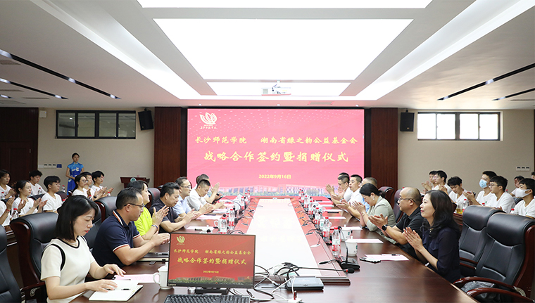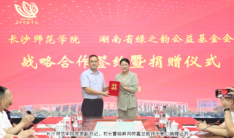 胡国安董事长表示,多年来,绿之韵在振兴实业的同时,积极承担企业公民责任,踊跃参与100多项社会公益项目,涉及赈灾济困、兴教助学、孤残救助、医疗卫生、修路饮水、养老医疗等多个领域,累计捐款捐物达7600多万元。少年强则国强,青少年是祖国的希望与未来。儿童成长一直是绿之韵公益基金会的重要关注点之一。此次向长沙师范学院捐资40万共建湖南省幼儿体质健康促进研究院,是秉承绿之韵“关爱生命 造福人类”的初心以及“关注儿童和青少年成长”的公益理念,开展“校企共建、幼体融合,推进学前教育高质量发展”的一种积极探索。希望深入推进“健康中国”的国家战略实施,共同推进湖南幼儿体质健康事业,扎实做好“幼有所育”大文章。此次校企共建湖南省幼儿体质健康促进研究院,将有效整合政府、高校、社会、企业的资源,建立起促进湖南省幼儿体质健康发展的产学研结合机制、智库平台和产品孵化基地,进一步推进体育与幼儿教育、科技、产业等方面的有机融合,形成一批支撑幼儿体质健康事业持续发展的关键技术,实现一批科研成果的转化。他相信,双方在幼儿体质健康、幼儿体育产业和家庭教育领域有着宽厚的合作基础,战略合作协议的签订更标志着双方合作迈出了坚实一步,希望未来校企双方能依托各自优质资源和学科优势,通过不断地资源整合、实现强强联手、协同融合、优势互补与合作共赢,对幼体融合相关科研课题研究攻关,预祝湖南省幼儿体质促进研究院早日取得科研成果,为幼儿体育生态体系,幼儿体育产业创新发展做出杰出的贡献,打造“校企合作”新蓝本。