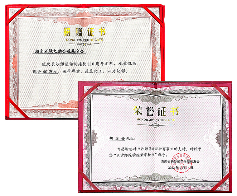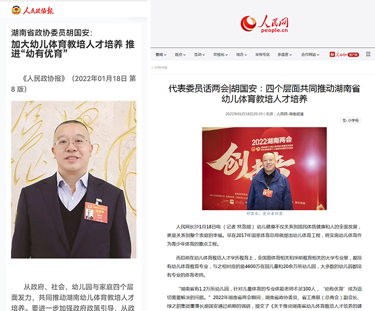 作为一名省政协委员,履职十多年来,胡国安董事长深入社区民情,积极参政议政,为湖南省经济发展献计献策,共提交了40份左右有价值的政协提案,涉及民创企业、青少年教育、扶危济贫、健康养老、疾病预防、省市区发展等多个方面。2022年湖南省两会期间,胡国安委员通过前期的调研,提交了《关于推动湖南省幼儿体育教培人才培养的建议》提案。针对湖南省幼儿园一般没有专职体育教师、幼儿体育教培机构的教师来源复杂、幼儿体育教培机构中兼职教师的比例高等问题,他提出建议从政府、社会、幼儿园与家庭四个层面发力,共同推动湖南省幼儿体育教培人才培养。长沙师范学院体育学院高度重视该提案的社会效应,胡国安委员多次亲自率领团队深入长沙师范学院就学前体育教师教育和幼儿体育事业发展进行调研。为感谢胡国安董事长对长沙师范学院教育事业的支持,会上,长沙师范学院党委副书记、校长曹晓鲜向胡国安董事长授予“长沙师范学院荣誉校友”证书。