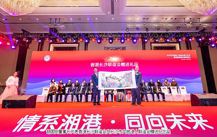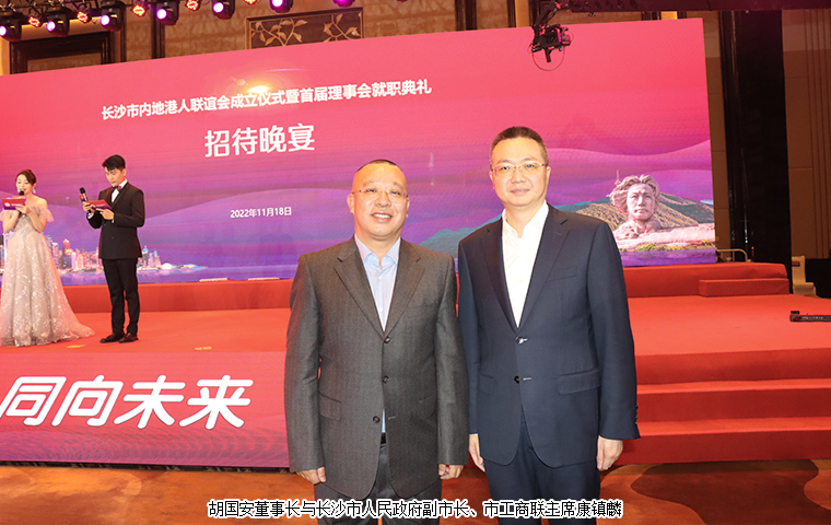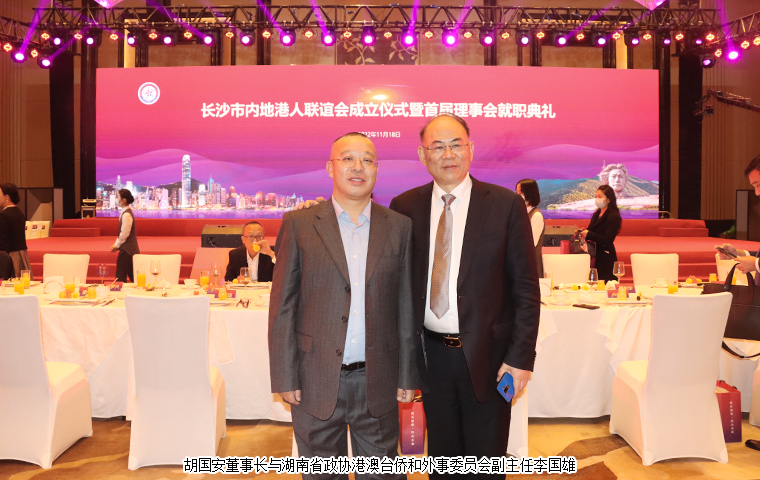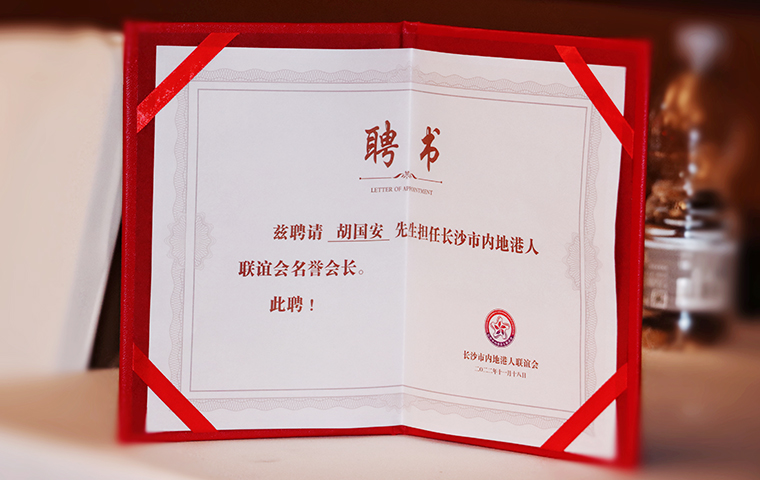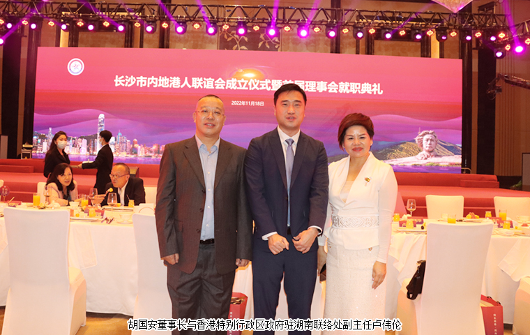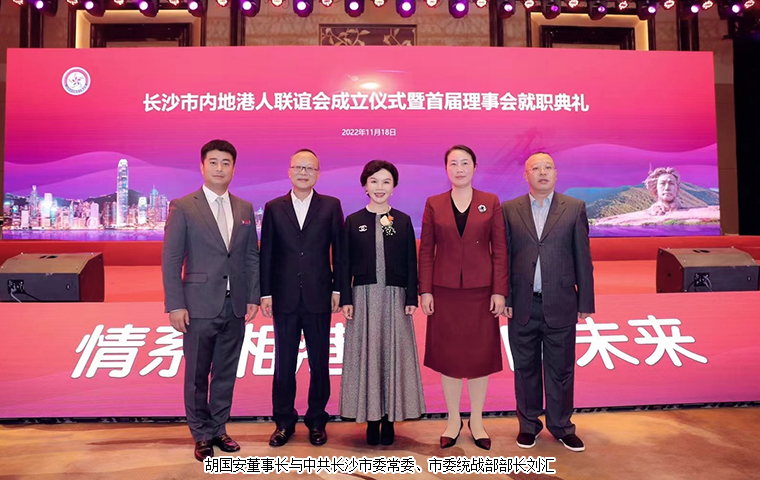 2022 年 11 月 18 日,长沙市内地港人联谊会成立仪式暨首届理事会就职典礼举行。中共湖南省委统战部副部长、省社会主义学院党组书记丁学新,湖南省政协港澳台侨和外事委员会副主任李国雄,中共长沙市委常委、市委统战部部长刘汇,长沙市人民政府副市长、市工商联主席康镇麟,长沙市政协副主席、党组成员刘金文,中共长沙市雨花区委书记刘素月,香港特别行政区政府驻湖南联络处副主任卢伟伦等领导出席活动。湖南省政协委员、湖南省慈善总会副会长、香港长沙联谊会名誉会长(代理会长)、香港长沙商会常务副会长,长沙市海外联谊会常务副会长,安博官网董事长胡国安先生受邀担任活动主礼嘉宾并受聘为长沙市内地港人联谊会名誉会长。