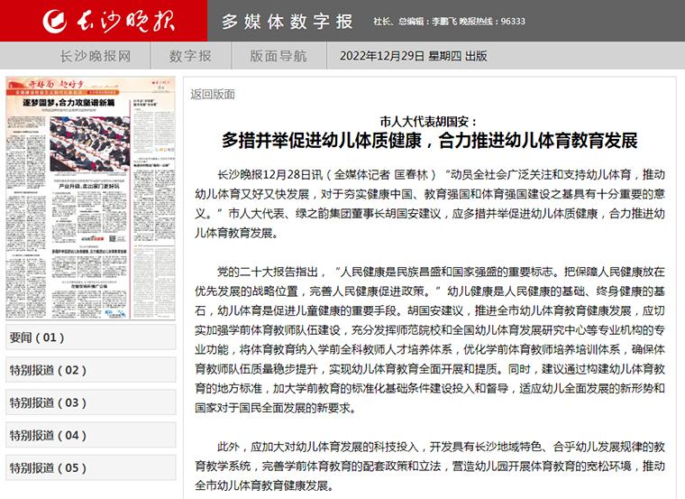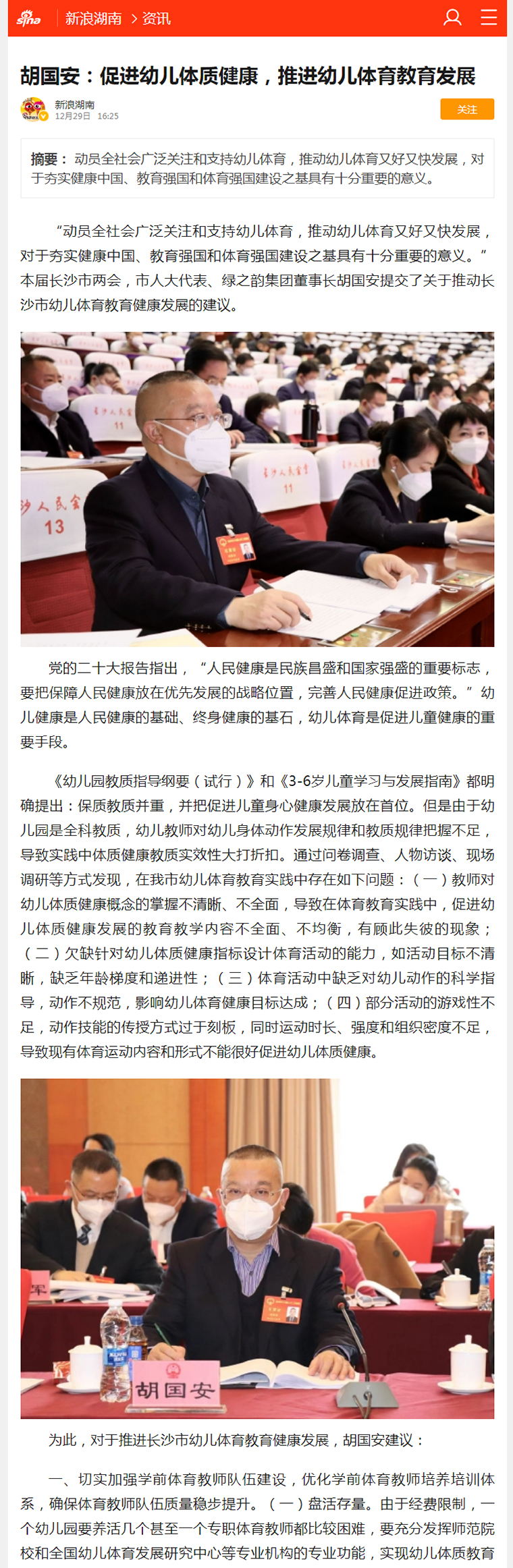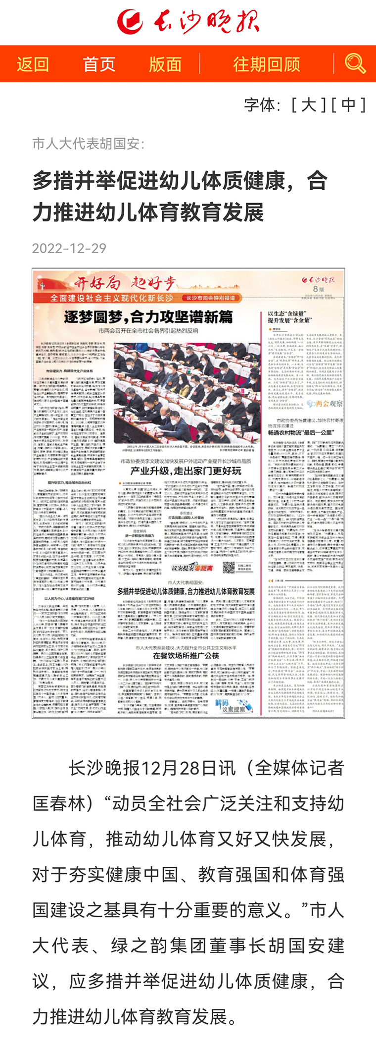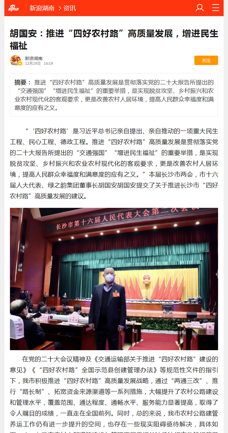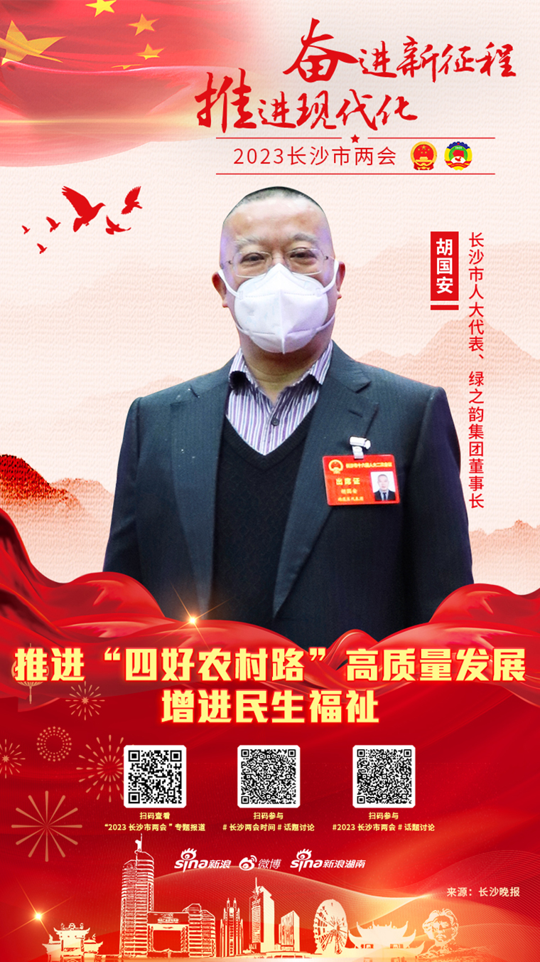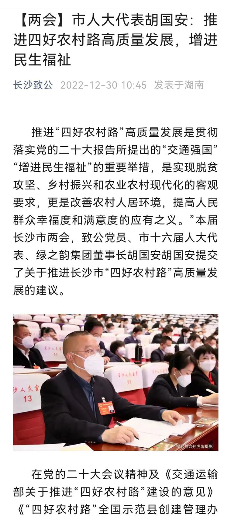 阔步新征程,建功新时代!2022年是党和国家发展进程中具有重要里程碑意义的一年,是长沙极不寻常、极不平凡的一年,也是胡国安代表与各条战线代表们共同依法履职的开局之年。这一年以来,胡国安代表在市人大及其常委会领导下,积极参加长沙市人大“乡村振兴长沙行”、“长株潭交通一体化规划与重点项目”、“聚焦强省会战略,助推高质量发展”、“平安建设”等重点项目调研和视察活动,践行了“人民选我当代表、我当代表为人民”的庄严承诺。2023年是长沙现代化征程战略机遇和困难挑战并存的重要窗口期,坚定的信心、顽强的斗志比以往任何时期都更重要。作为在长沙这片沃土上成长起来的民营企业,绿之韵将认真贯彻落实今年长沙“两会”精神指示,准确把握所处发展阶段,奋力担当历史使命,稳住向上向好发展态势,全领域、全方位、全过程贯彻高质量的发展要求,深入推进“大品牌+大健康+大金融”的发展战略,聚焦实业,做精主业,更加注重发展方式绿色转型,更加注重激发干事创业活力,积极承担企业公民责任,把企业发展脚步与乡村振兴工作进行有效衔接,紧紧围绕全面落实“三高四新”战略定位和使命任务、大力实施“强省会”战略,创新实干,勇毅前行,为建设现代化新长沙作出更大的贡献!