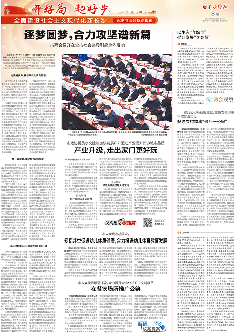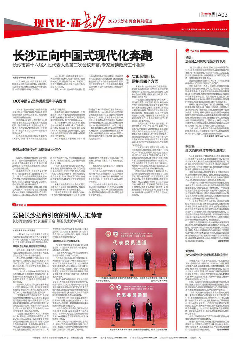 凝心聚力谋发展,砥砺奋进谱华章。“今天在大会现场认真聆听了市长所作的政府工作报告,倍受鼓舞,深受启发,更是充满信心。整个报告对长沙过去的一年做了全面、客观的总结,各行各业、各个领域都取得了非常好的成绩,这是非常来之不易的。同时,也对长沙未来一年的工作做了科学的规划,擘画了宏伟的蓝图。报告总结成绩有高度,分析问题有深度,部署工作有力度,关注民生有温度。作为人民代表,我们要深入学习宣传贯彻二十大精神,切实履职尽责,为建设现代化新长沙作出努力和贡献!”胡国安代表在接受《潇湘晨报》、《长沙晚报》、长沙新闻频道等多家媒体采访时,难掩内心的激动与振奋。