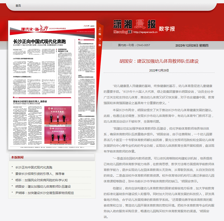 会议期间,胡国安代表广泛同各界别代表们分别围绕市委、市政府的中心工作,聚焦长沙现代化新征程和人民群众普遍关心的重点问题,进行深入探讨和交流。此次会议,他提交了《关于推进我市“四好农村路”高质量发展的建议》和《关于推进我市幼儿体育教育健康发展的建议》两件议案。推进“四好农村路”高质量发展是贯彻落实党的二十大报告所提出的“交通强国”“增进民生福祉”的重要举措,是实现脱贫攻坚、乡村振兴和农业农村现代化的客观要求,更是改善农村人居环境,提高人民群众幸福度和满意度的应有之义。胡国安代表建议要按照技术标准,推动农村内部道路建设升级;要加快立法调研,修订《长沙市公路管理规定(2010)》;要拓宽筹资渠道,引导社会资本广泛参与;要加强设计施工融合,探索推行EPC承包模式;要尽快专门立法,加强长沙市农村公路养护。《关于推进我市幼儿体育教育健康发展的建议》中,建议切实加强学前体育教师队伍建设,优化学前体育教师培养培训体系,确保体育教师队伍质量稳步提升;政府应该构建幼儿体育教育的国家或省级地方标准,加大学前教育的标准化基础条件建设投入和督导;加大对幼儿体育发展的科技投入,研发具备地方特色、合乎幼儿发展规律的教育教学系统;完善学前体育教育的配套政策和立法,营造幼儿园开展体育教育的宽松环境。胡国安代表今年的两件议案,内容紧扣当前焦点热点话题,受到与会代表的广泛认同,引发多家新闻媒体聚焦报道。