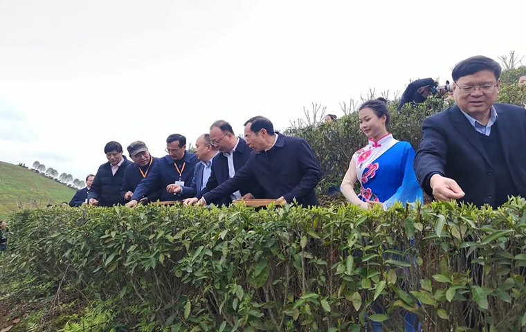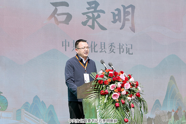 中共安化县委书记石录明致欢迎辞。人与人的相遇莫过于久别重逢,人与茶的相遇便是前世今生。非常荣幸,今天由我用一盏茶的时间与大家一同品味安化独特的诗和远方。从春天出发,用一盏茶的时间,感受万里茶路马蹄声的古道茶香之美。从春天出发,用一盏茶的时间,领略高山流水遇知音的山水画卷之美。从春天出发,用一盏茶的时间,纵享十步之内有芳草的人杰地灵之美。安化黑茶开园节的举办,标志着安化36万亩茶园进入了全面开采期。人生如茶,希望我们都能从春天出发,从安化出发,一起赴一场春日采茶的清新之旅。