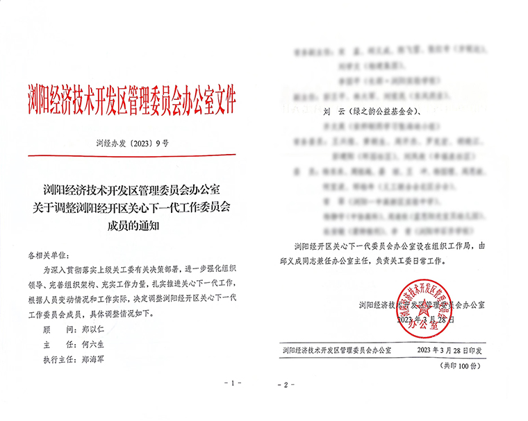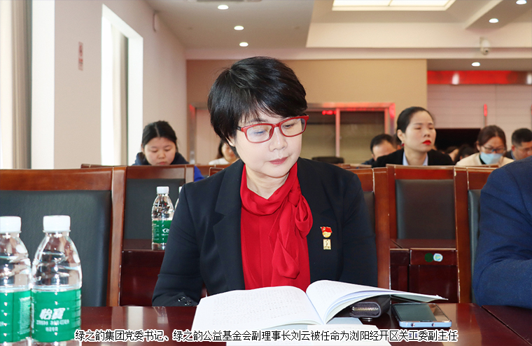 会上,浏阳经开区党工委委员、管委会副主任、关工委主任何六生主持会议。浏阳经开区组织工作局局长、关工委常务副主任宋孟宣读浏阳经济技术开发区管理委员会《关于调整浏阳经开区关心下一代工作委员会成员的通知》,绿之䪨集团党委书记、绿之韵公益基金会副理事长刘云被任命为浏阳经开区关工委副主任。