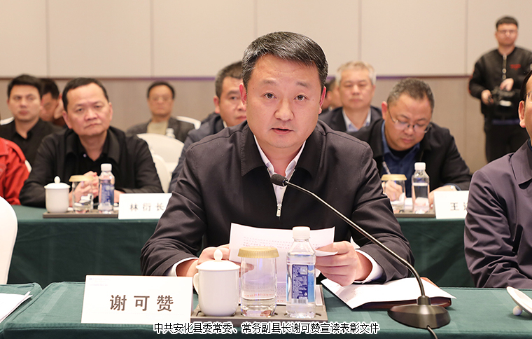 会议最后,中共安化县委书记石录明讲话。他首先代表县委、县人大、县政府、县政协和103万父老乡亲对出席会议的各位乡友、各位企业家表示热烈的欢迎,对大家一直以来心系故里,不遗余力地支持家乡发展表示衷心的感谢。近年来,在中央、省、市的坚强领导下,在社会各界的支持帮助下,安化始终坚持统筹发展和安全,全力办好发展经济这个最大实事,坚定不移走生态优先、绿色发展之路,用心用情用力增进民生福祉,全面建成了小康社会,顺利摘掉了“国贫县”的帽子,成功创建国家卫生县城、全国生态文明建设示范区、全国“三茶统筹”先行县、省文明城市、省平安县,经济社会发展实现了稳中有进、进中向好。他表示,如今的安化,是一个政策集成、机遇叠加的新安化;是一个产业兴起、活力迸发的新安化;是一个经促联谊、汇聚合力的新安化。广大乡友是家乡发展和建设的重要组成部分,也是推介安化不可或缺的中坚力量,地位举足轻重、作用十分重要,希望在外的广大乡友能够当好宣传员,积极宣传来安发展的优势和机遇,帮助家乡做大“朋友圈”,让更多的人了解安化、走进安化、投资安化;当好家乡建设发展的指路人、对外开放的牵线人、社会事业的热心人、投资兴业的带头人,共同把安化建设得更加美好。安化县委县政府鼓励重视和支持乡友发展的决心坚定不移,坚持“三不为过”原则,全力打造“不叫不到、随叫随到、说到做到、服务周到、主动报到”的一流营商环境,以最好的政策、最高的礼遇,让广大乡友在安化充分被尊重,在安化把事业做大、做强、做久,共同谱写安化高质量发展新篇章。