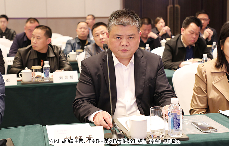 安化县政协副主席、工商联主席刘畅术通报全县经促 (商会) 工作情况。中共安化县委副书记、县长潘文剑通报全县经济社会发展情况。他表示,2022年,安化产业发展焕发新活力,高质量发展增添新动能,乡村振兴打开新局面,营商环境实现新改善,人民生活达到新水平。下阶段,安化将以全面贯彻党的二十大和全国两会精神为主线,全心全意落实“三高四新”战略定位和使命任务,推动安化经济社会高质量发展。他衷心希望,各位乡友和企业家们一如既往的关心支持家乡发展,当好家乡的宣传员,积极回家投资兴业。安化县委县政府也将为投资者提供最丰富的土壤、最充足的阳光、最清晰的空气、最滋润的雨露,携手共建美丽家乡,共创安化美好未来。随后,与会代表结合自身在外工作经历和返乡后的所见所闻,积极畅谈家乡的发展变化,并围绕招商引资、产业发展等方面积极建言献策,现场气氛热烈活跃。