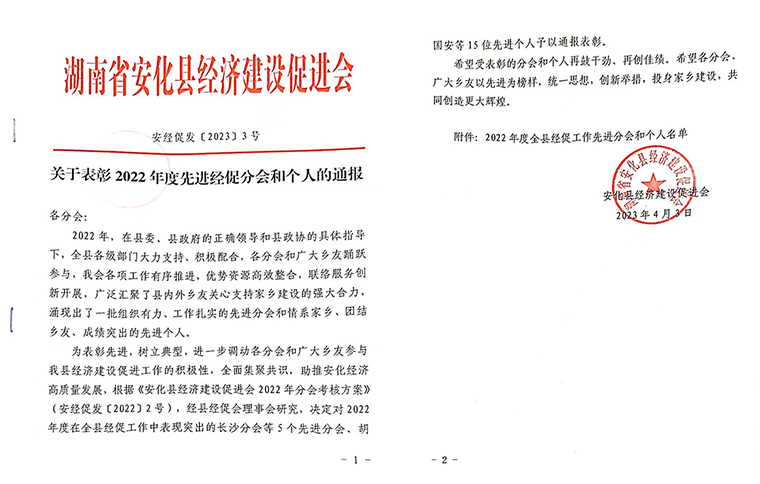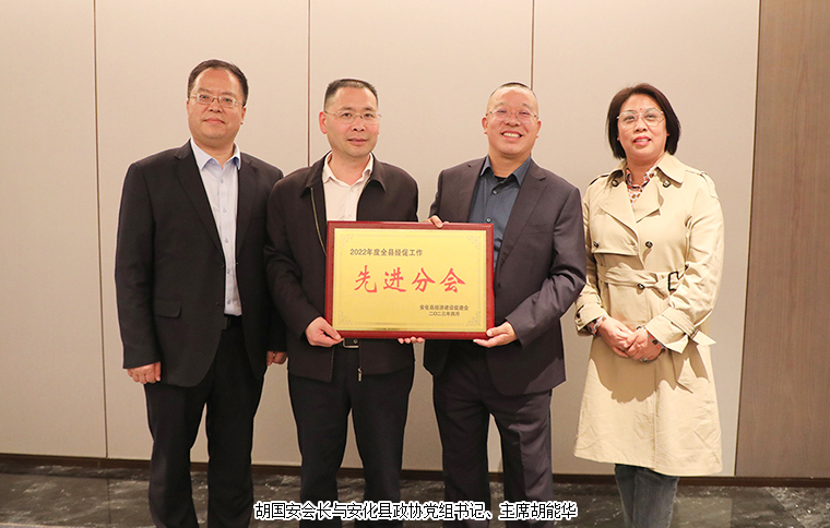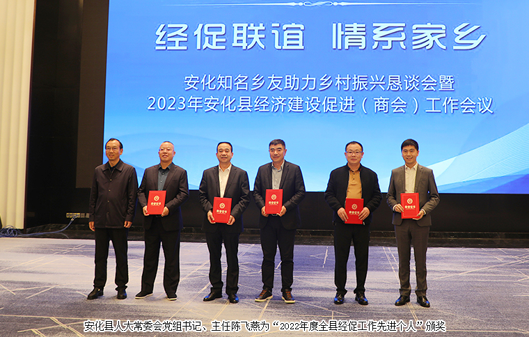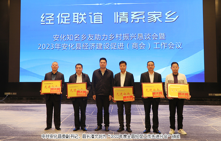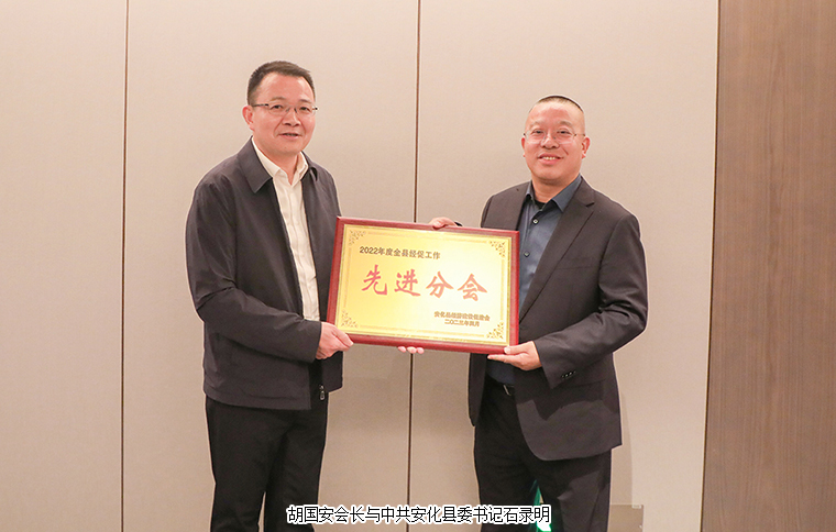 大会由安化县政协党组书记、主席胡能华主持。中共安化县委常委、常务副县长谢可赞宣读《关于“迎老乡回故乡建家乡”突出贡献先进个人的通报》《关于表彰 2022 年度先进分会和个人的通报》。与会领导为获奖的先进单位及个人颁奖。凭借着在过去一年中在全县经促工作中的突出表现,胡国安会长被评为“2022年度全县经促工作先进个人”,长沙市安化商会被评为“2022年度全县经促工作先进分会”。