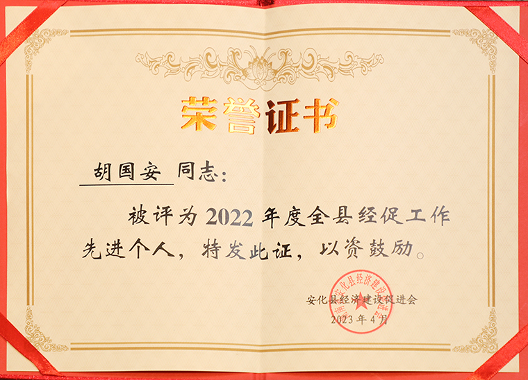 胡国安会长表示,此次被评为“2022年度全县经促工作先进个人”,既是一份荣誉,更是一份沉甸甸的责任。作为一名从安化大山深处走出来的企业家,他深知积极投资家乡,建设家乡,是自己与生俱来的责任与使命。多年来,他带领企业安博官网先后在湖南益阳投资建设中药材种植生产基地、在湖南安化投资建设黑茶种植生产基地。2022年5月,绿之韵公益基金会向湖南省慈善总会捐赠200万爱心款项,专项用于乡村振兴项目。并与安化胡家村等6个村落签订结对帮扶协议,携手村企共建,助力乡村产业振兴。6月,绿之韵与安化县长吉中药材合作社达成以黄精种植为依托的产学研基地战略合作意向。7月,绿之韵与安化县工商联签订《帮扶乡村振兴重点县战略协议》。2023年3月,捐资100万在安化冷市镇开展“乡村爱心书屋”建设并设立“绿韵圆梦奖学金”。截至目前,绿之韵支援安化的足迹遍布安化高明乡、古楼乡、冷市镇、江南镇、烟溪镇等地,项目涉及赈灾济困、兴教助学、孤残救助、医疗卫生、修路饮水、养老医疗、中药材种植加工等,累计向安化县捐赠款物近700万元,参与各类社会公益事业累计捐赠款物7600多万元。作为安化县经济建设促进会长沙分会理事长(长沙市安化商会会长),未来他将牢固树立崇高的使命感和强烈的责任心,将自身及企业的发展同家乡的经济社会发展紧密结合,与商会各位优秀的企业家一起认真尽责履职,积极为家乡发展建言献策,助力家乡乡村振兴。同时,依托经促会、商会优势加强多方交流,搭建好在外游子与家乡沟通的平台与桥梁,凝聚更多的资源和力量,用切实的行动带动更多的安化籍企业家助力家乡建设,为助力安化高质量发展作出新的更大贡献。