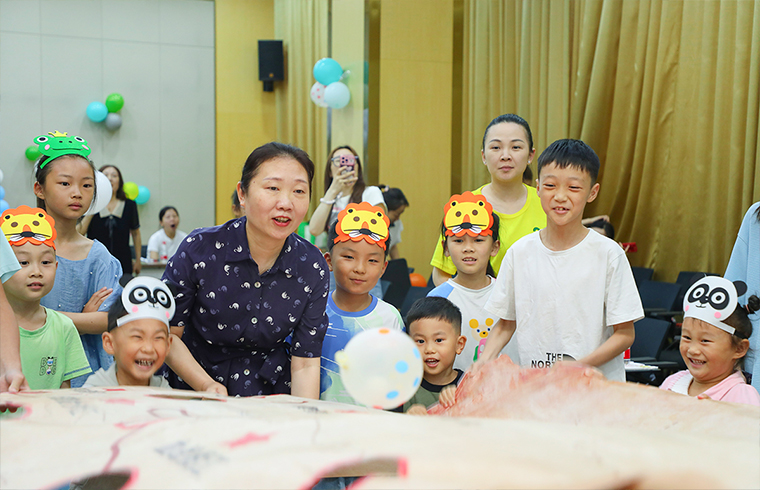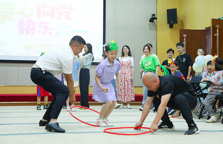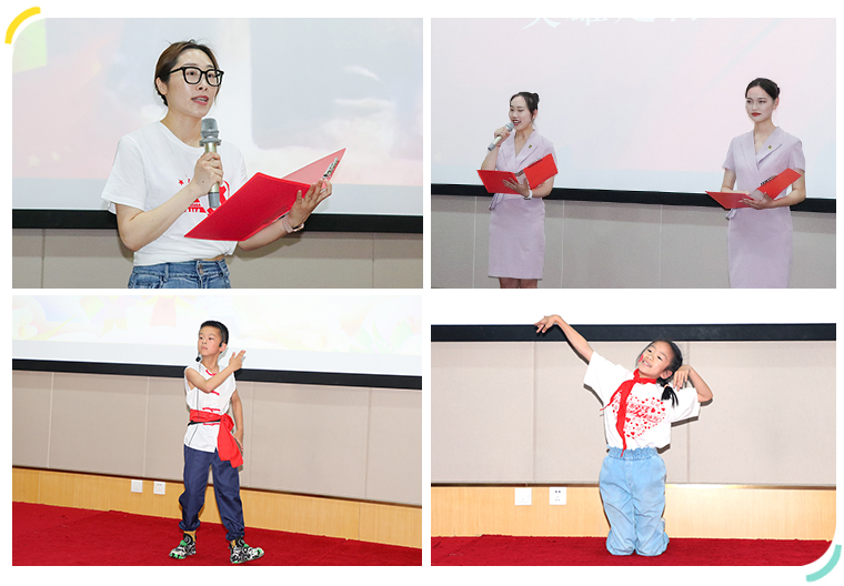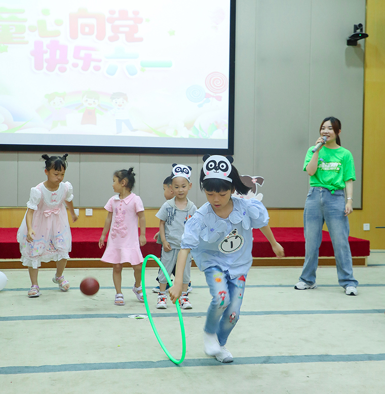 彩色主题墙、彩色气球将活动现场装扮得充满着浓浓的节日氛围。工作人员穿上玩偶服,装扮成“韵小宝”、“小兔子”,为她们送上五彩缤纷的气球和节日的祝福。在“圈圈接力赛”、“重走长征路”、“滚圈圈”等一系列亲子小游戏中,家长与孩子密切配合、相互协作,全场成为一片欢乐的海洋;孩子们自信地展示自己的才艺,跳街舞、即兴篮球表演、背诵唐诗......孩子们在舞台上闪闪发光,出色的表演,赢得满场喝彩与掌声。