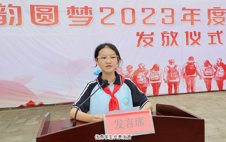 爱心传递希望,爱心铸就梦想。仪式上,主持人宣读2023年度绿之韵奖教奖学金发放名单,领导嘉宾依次为获得表彰的师生发放奖教奖学金。获得优秀奖学金表彰的学生代表现场发言。她向捐资助学的绿之韵公益基金会以及辛勤培育学子的老师致以最诚挚的谢意,并表示奖学金不仅在物质上给予困难学生极大的实质性帮助,更是一种精神上的鼓励,你们的爱心カ量为我们增添了生活的勇气。在今后的学习和生活中,将不断地努力,不骄不躁,不轻言放弃,以一颗平常心,踏实勤奋,取得好成绩。把爱心接力棒接过来,传下去,让爱心行动像长江水黄河浪一样生生不息。
