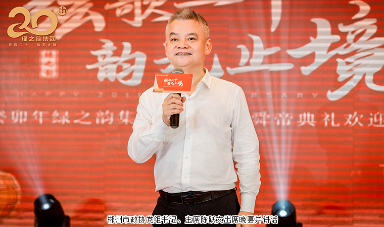 山水画卷郴州相见,郴州遇见一生眷恋。晚宴尾声,郴州市政协党组书记、主席陈跃文讲话。他表示非常高兴今天能和绿之韵的精英们相聚在郴州,他介绍,郴州有非常优越的区位优势;郴州有着非常丰富的矿产资源;郴州有非常好的旅游景点,郴州东江湖,人间天上一湖水,万千景象在其中。他欢迎在场所有企业家到郴州观光旅游,投资兴业。今年绿之韵迎来了二十周年,他坚信有在座所有人的努力,绿之韵一定能够从一个胜利走向另一个胜利,从一个辉煌走向另一个辉煌,他期待和大家一起见证绿之韵的30年、40年、50年、100年。
