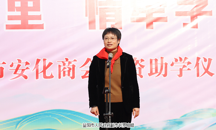 活动最后,益阳市人民政府副市长罗晓皓讲话。她首先代表益阳市委、市政府向长沙市安化商会的爱心企业家表示崇高的敬意和衷心的感谢。参加此次活动,她深受感染和触动,一是感恩家乡山山水水、父老乡亲的养育,感恩母校的培育,让我拥有了走出大山的机会;二是感谢各位企业家在今年经济形势下行的情况下,克服困难,慷慨解囊,走进大山资助山村教育;三是希望家乡兴旺发达,希望安化的教育事业蒸蒸日上,希望有更多的人才扎根山村教育,培根育苗播种,希望同学们心怀梦想、发奋读书,以期未来建设家乡,回报社会。