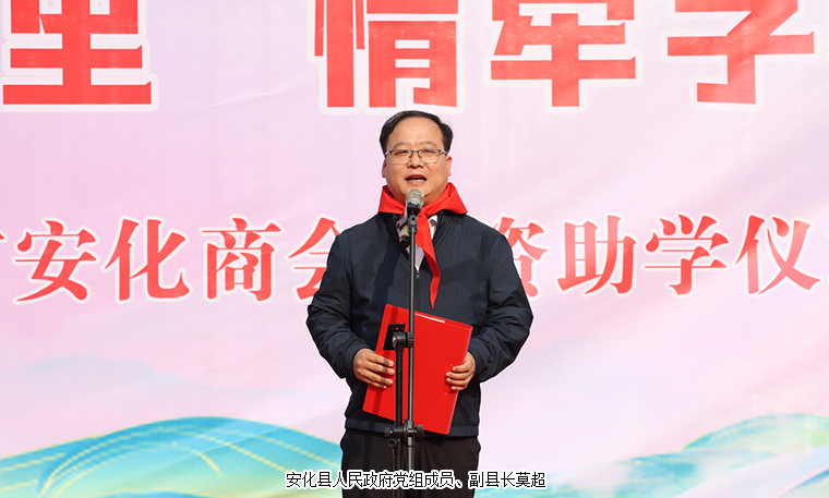 安化县人民政府党组成员、副县长莫超表示,近年来县委县政府始终把教育作为重中之重的民生,始终把教育事业摆在优先发展位置,以办人民满意的教育为宗旨,紧紧围绕打造区域教育强县目标,完善机制、加大投入、优化资源,有力推动了全县教育事业持续健康发展。但是,安化地处山区,仍然有相当一部分农村偏远学校教育教学设施待改善,优质师资力量急需补充。在政府部门着力部署解决的同时,社会各界人士也纷纷向我们伸出援助之手,捐资助学。今天长沙市安化商会的爱心企业家们慷慨解囊为我县马路镇苍场完小送来校服、体育器材和资金支持。这种善举,用实际行动在全社会倡导了尊师重教的良好风尚,也充分体现了从安化走出去的企业家们情寄安化、心系教育的桑梓情怀。希望在座的各位同学要珍惜拥有、懂得感恩。在现在与将来,要始终保持谦虚谨慎、端正积极、奋发向上的态度,勤学苦练、刻苦学习,用优异的成绩回报爱心企业的资助,并将这份大爱传递下去。