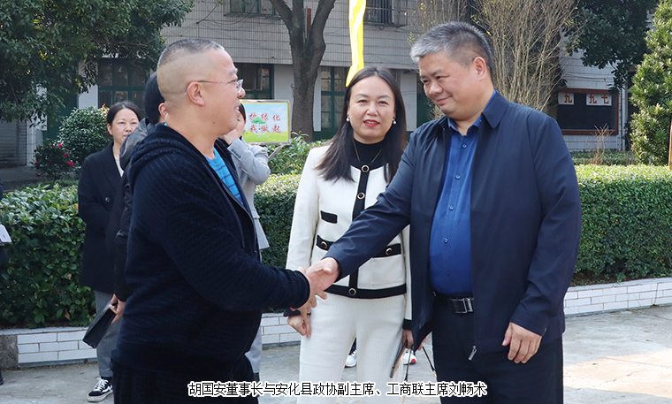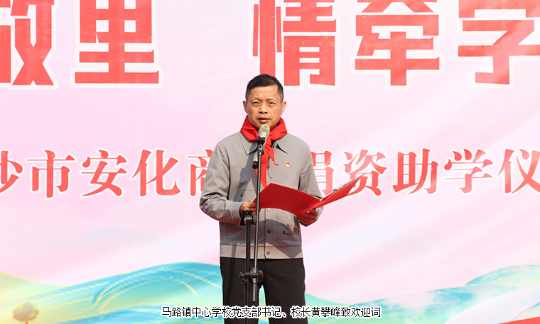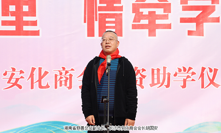 捐赠仪式上,胡国安会长讲话。他首先向参加活动的领导致以真挚的感谢,向辛勤耕耘在教育一线的学校各位领导和老师致以崇高的敬意,向家乡的父老乡亲和同学们表示亲切的问候。建设家乡,回报桑梓是我们每一个安化人的梦想。长沙市安化商会积极作为,主动承担非公经济企业的社会责任,组织会员积极参加公益活动,累计捐赠款物近900万元。作为从安化大山里走出的企业家,积极投身到建设家乡的事业中去,是我们与生俱来的责任与使命。今天我们在安化马路镇苍场完小和东坪镇完全小学捐赠50万元爱心款项,为改善学校教学环境和条件提供力所能及的帮助,给予那些品学兼优的学生和辛苦耕耘的老师更多鼓励和学习的机会,希望营造浓厚的关心教育和培养人才的浓厚氛围。同时,也希望学校的优秀师生代表可以坚定理想信念,树立远大抱负,把这份殷殷爱心转化为成才之志、奋发之源,在建设家乡、投身乡村振兴、回报社会的生动实践中放飞青春梦想。希望每一个走出安化的人都可以不忘家乡养育之恩,大力支持家乡各项事业发展,为建设新时代高质量、富饶美丽的安化贡献一份力量。