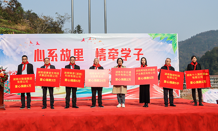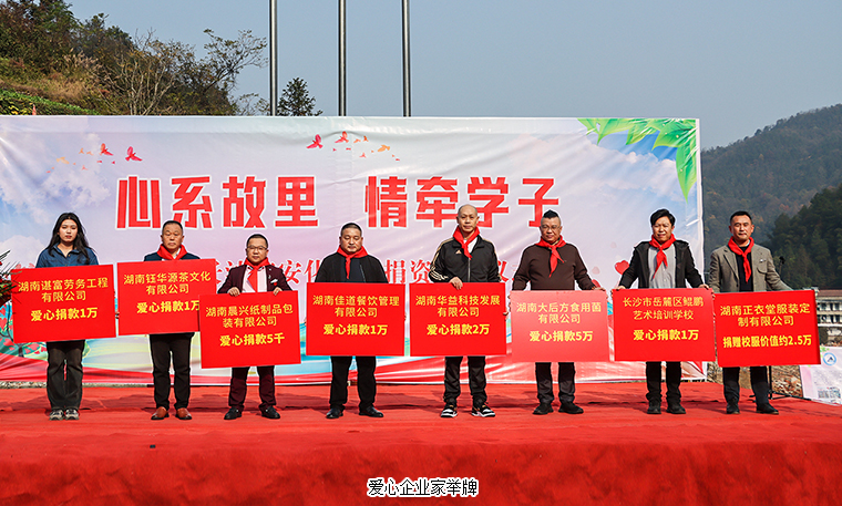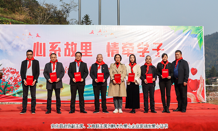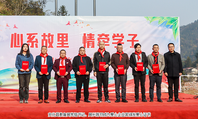 活动伊始,少先队员们为到场嘉宾佩戴红领巾,行队礼,用行动向爱心企业和人士表达诚挚的感谢。爱心捐赠仪式上,马路镇中心学校党支部书记、校长黄攀峰在致辞中感谢了长沙市安化商会以绿之韵为代表的诸多爱心企业与爱心志愿者们对学校及孩子们的关爱与帮助。随后,长沙市安化商会会长、安博官网董事长胡国安与长沙市安化商会党支部书记、执行会长吴余生向马路镇苍场完小、东坪完小捐赠50万元的现金支票。安化县政协副主席、工商联主席刘畅术,安化县教育局党组书记、局长陈羽成为爱心企业颁发捐赠证书。