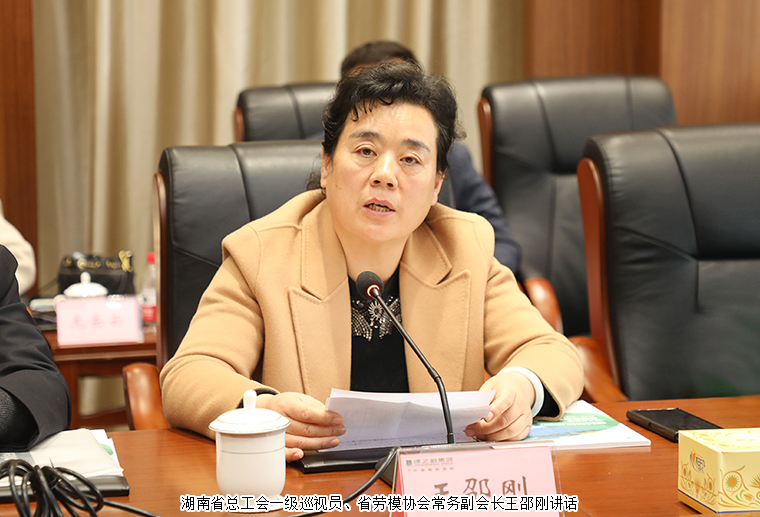 湖南省总工会一级巡视员、省劳模协会常务副会长王邵刚讲话。她表示,习近平总书记在2020年全国劳动模范和先进工作者表彰大会上指出,“劳动模范是民族的精英、人民的楷模,是共和国的功臣。我国是人民当家作主的社会主义国家,党和国家始终坚持全心全意依靠工人阶级方针,始终高度重视工人阶级和广大劳动群众在党和国家事业发展中的重要地位,始终高度重视发挥劳动模范和先进工作者的重要作用。”劳模一直在提升行业的形象方面发挥着重要作用,我们要加强劳模的联系,勾起一张横向到面、纵向到底的网络,增强劳模之间的交流与沟通;要做好劳模的宣传工作,宣传劳模工作敬业、无私奉献的精神和劳模的技能;要发挥劳模本身的榜样力量,引领更多的人在工作中追求卓越,不断超越自己;要落实劳模待遇,为劳模办实事、做好事、解难事,将组织的温暖关怀落到实处;要大力弘扬工匠精神,当好促进经济社会发展的主力军,让劳动光荣、创造伟大成为铿锵的时代强音,让劳动崇高、劳动美丽在全社会蔚然成风。