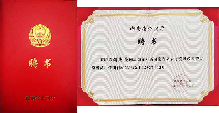 再次被受聘为湖南省公安厅党风政风警风监督员,胡国安董事长深感责任重大。他表示,一直以来,他对监督员的身份始终葆有一种神圣的使命感和责任感。这份聘书是沉甸甸的,不仅是一种光荣,更肩负着广大普通民众的瞩托。未来,他一定不辜负湖南省公安厅党委的期望,不辜负广大民众的重托,依法依规行使监督员的职责,当好人民的“调研员”,深入调研了解广大群众对公安工作的意见和建议;当好人民的“查纠员”,行使好监督员的群众监督作用;当好人民的“参谋员”,向公安机关传送群众的呼声和期盼、积极建言献策;当好人民的“宣传员”,帮助讲好警察故事,积极引导社会各界理解、支持公安工作,为形成人人遵法守法、自觉配合执法的良好社会氛围,助力全省公安工作现代化贡献出自己的一份力量。