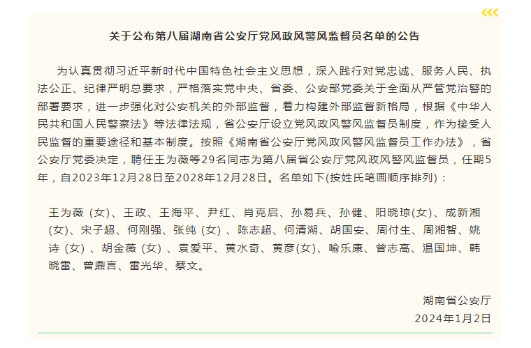 据了解,湖南省公安厅建立党风政风警风监督员制度,是认真贯彻习近平新时代中国特色社会主义思想,深入践行对党忠诚、服务人民、执法公正、纪律严明总要求,严格落实公安部及省公安厅党委关于全面从严管党治警的部署,接受人民监督的重要途径和重要制度。“监督员”的主要职责是对公安机关及其人民警察依法履行职责、行使职权、遵守纪律等党风政风警风情况进行监督,收集、反映社会各界群众对公安工作和队伍建设的意见建议,收集、反映公安工作和公安队伍建设存在的困难问题,宣介公安机关及其人民警察的先进事迹,以及其他能够促进公安工作和公安队伍建设的方式方法履行职责。