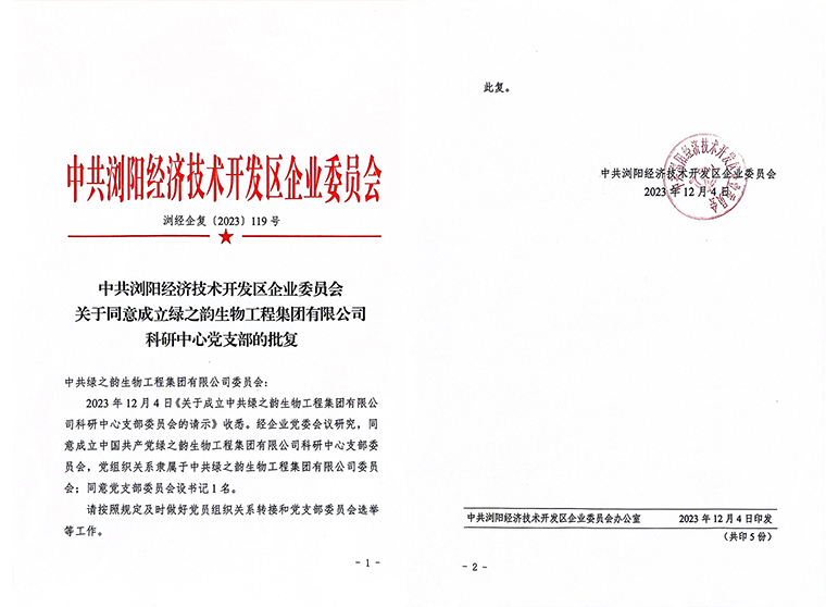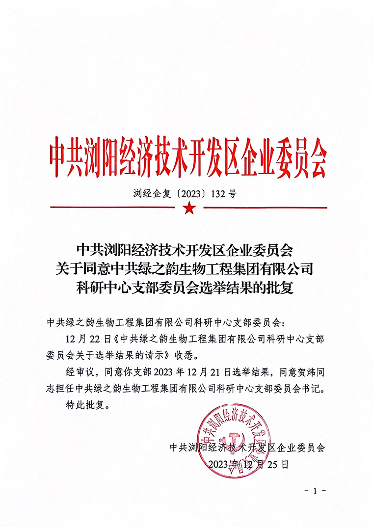 为贯彻落实党的二十大精神,进一步加强基层党组织建设,以党建工作引领科研技术攻关,充分发挥党建工作对企业的引领作用,经中共浏阳经济技来开发区企业委员会批复同意,中共绿之韵生物工程集团有限公司科研中心党支部正式成立,贺炜同志当选为党支部委员会书记。