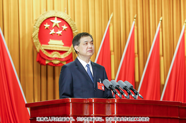 在热烈的掌声中,湖南省人民政府副省长、长沙市委副书记、市长周海兵向大会报告政府工作。报告共分三部分:一是2023年工作回顾;二是2024年工作重点;三是提高政府治理能力和水平。周海兵说,2023年是全面贯彻党的二十大精神的开局之年,是三年新冠疫情防控转段后经济恢复发展的一年。我们在省委、省政府和市委的坚强领导下,全面贯彻党的二十大精神,深入开展学习贯彻习近平新时代中国特色社会主义思想主题教育,聚焦实现 “三高四新”美好蓝图,深入践行八个 “走在前、作示范”要求,全力打好 “发展六仗”,踔厉奋发、创新实干,交出了一份高质量发展的合格答卷。