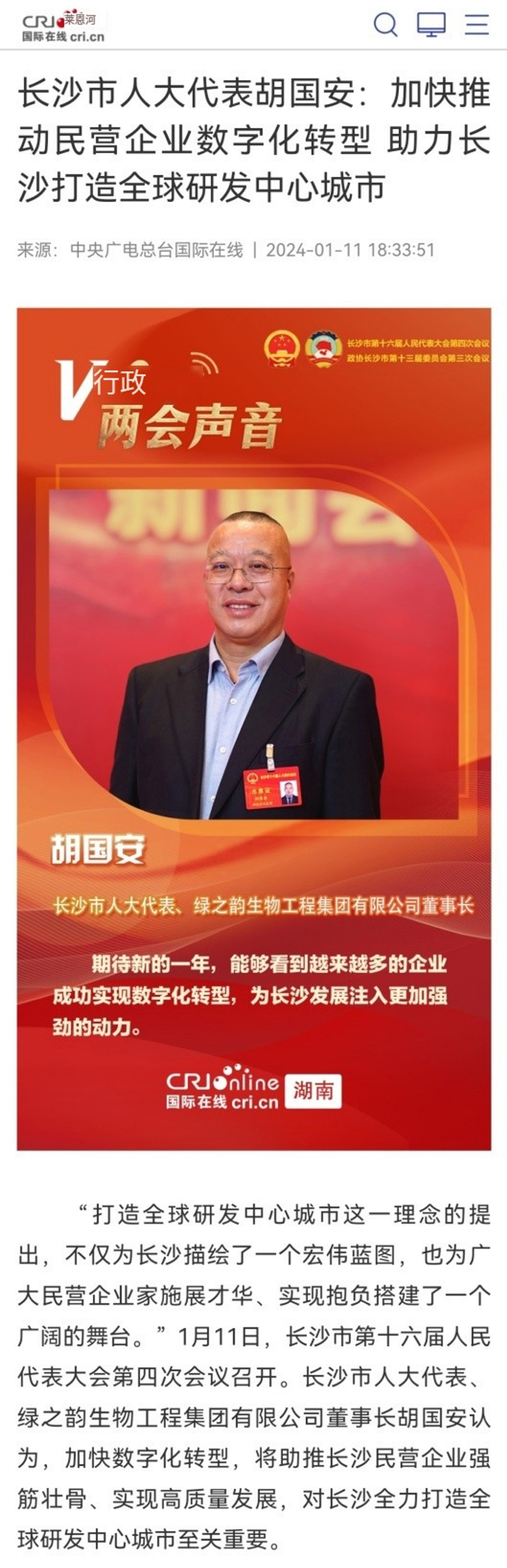 阔步新征程,建功新时代!2023年是全面贯彻党的二十大精神的开局之年,也是三年新冠疫情防控转段后经济恢复发展的一年。这一年以来,胡国安代表在市人大及其常委会领导下,积极参加长沙市人大“乡村振兴长沙行”、“长株潭交通一体化规划与重点项目”、“聚焦强省会战略,助推高质量发展”、“平安建设”等重点项目调研和视察活动,践行了“人民选我当代表、我当代表为人民”的庄严承诺。2024年是中华人民共和国成立75周年,是人民代表大会制度建立70周年,是实施 “十四五”规划的关键一年,是长沙现代化征程战略深入推进的关键发展时期。作为在长沙这片沃土上成长起来的民营企业,绿之韵将认真贯彻落实今年长沙“两会”精神指示,准确把握所处发展阶段,奋力担当历史使命,稳住向上向好发展态势,全领域、全方位、全过程贯彻高质量的发展要求,深入推进“大品牌+大健康+大金融”的发展战略,聚焦实业,做精主业,更加注重发展方式绿色转型,更加注重激发干事创业活力,积极承担企业公民责任,把企业发展脚步与乡村振兴工作进行有效衔接,紧紧围绕全面落实“三高四新”战略定位和使命任务,创新实干,勇毅前行,为建设现代化新长沙作出更大的贡献!