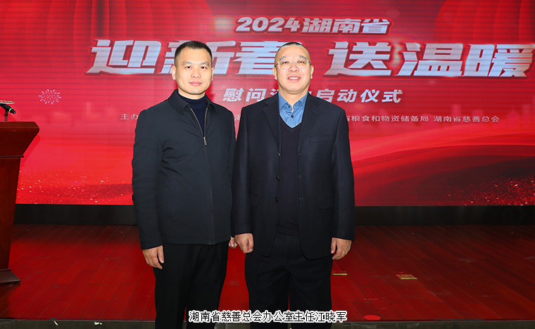 随后,湖南省政协原主席、省慈善总会总顾问王克英,湖南省人民政府党组成员、副省长李建中,湖南省政府办公厅一级巡视员黎咸兴,湖南省民政厅党组书记曹忠平,湖南省民政厅厅长黄东红,湖南省应急管理厅一级巡视员赵军,湖南省粮食和物资储备局党组成员、副局长覃世民等领导上台共同启动2024年湖南省“迎新春 送温暖”慰问活动。