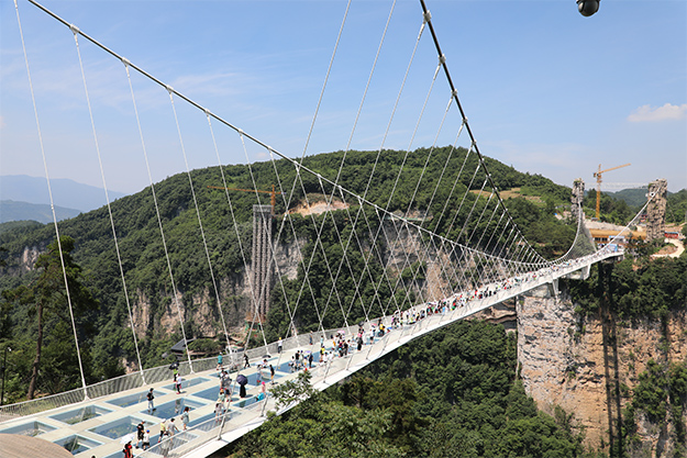 张家界大峡谷玻璃桥又名“云天渡”,有着"天桥合一,以渡天下之人"的美誉,是一座全透明玻璃景观桥梁,兼具景区行人通行、游览、蹦极、溜索、T台等功能,也是世界最高最长的斜拉式高山峡谷玻璃桥。在云雾之间,大桥宛如千尺白绫在其中若隐若现,一踏上桥面便从山水之中突然超脱出山水之外。绿之韵家人们漫步在玻璃桥,轻吻蓝天白云,渡过峡谷从桥这头走到那头,仿佛也将家人们的心渡得更加接近。