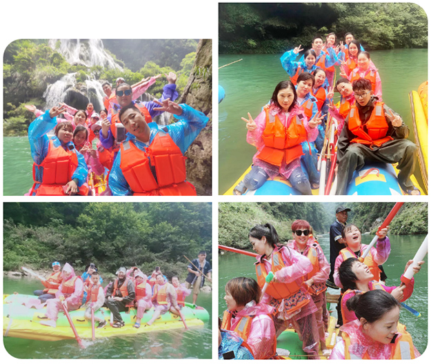 “张家界看山,猛洞河玩水。”在猛洞河,绿之韵家人们乘坐着小筏,从“哈妮宫”出发,顺水而下,一叶扁舟,在原始次生林的高山峡谷之中,身着救身衣、乘皮舟、闯险滩、博激流、沿途观美景、沐瀑流、打水仗、过峡关,出没浪端谷底,途经三角岩、鸡笼门、捏土瀑布、阎王滩、落水坑瀑布、梦思峡等数十个景点,两岸秀丽的风光无不令人叫绝观止。家人们在漂流途中放歌长啸,或搏浪闯滩,或戏水嬉闹,找回快乐童真的自我。