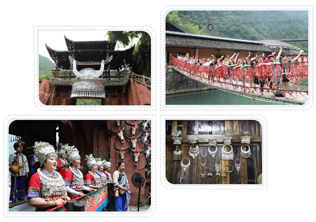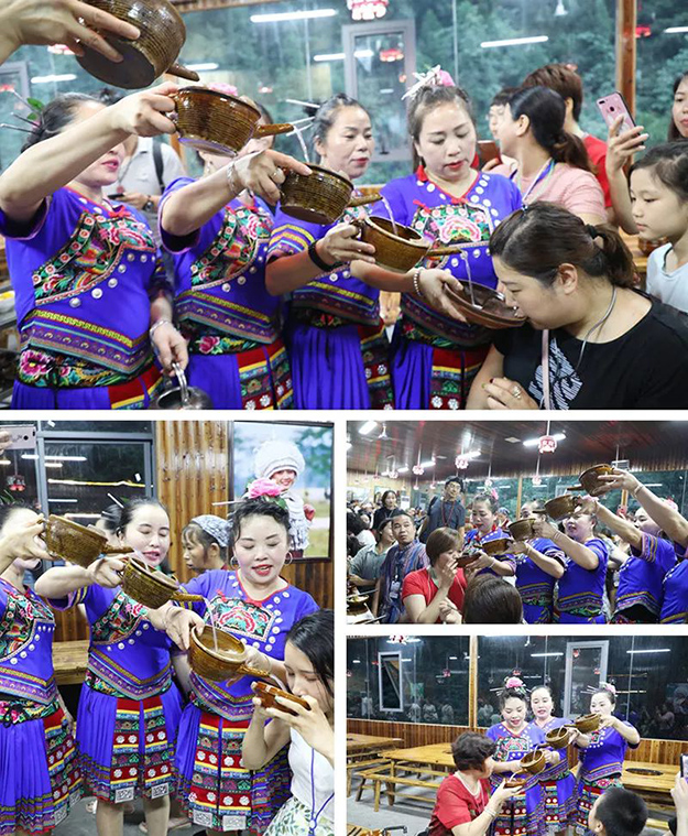 经过了激情的漂流,绿之韵家人们来到了美丽的夯吾苗寨。夯吾苗寨在苗语中寓意着“峡谷溪边美丽的苗寨”。寨内保存着武陵大山少数民族特有的木质结构吊脚楼风貌。绿之韵家人们在此亲身体验唱山歌、饮拦门酒、哭嫁等苗族风俗,体验“神秘湘西、茶富古丈"的气息与魅力。绿之韵家人们在导游的带领下来到苗族阿妹的家中品茗休憩,走街串巷感受苗寨不一样的风光。
