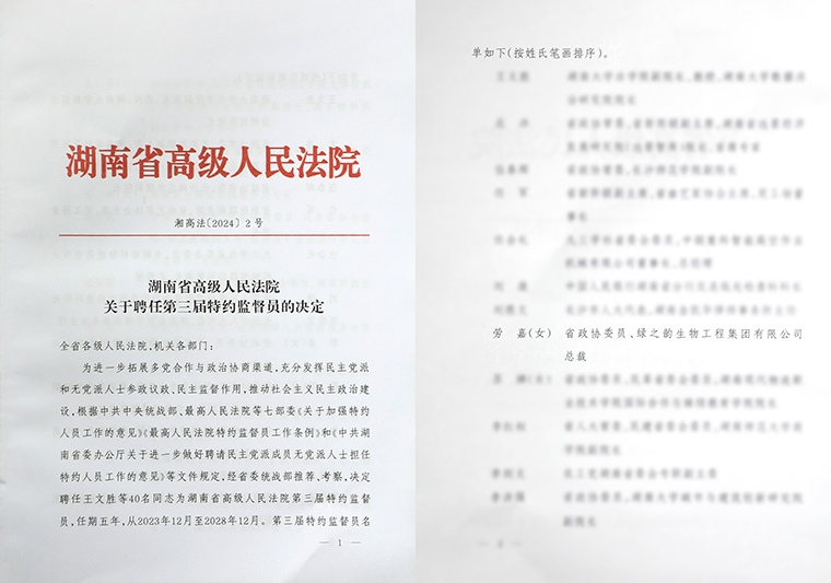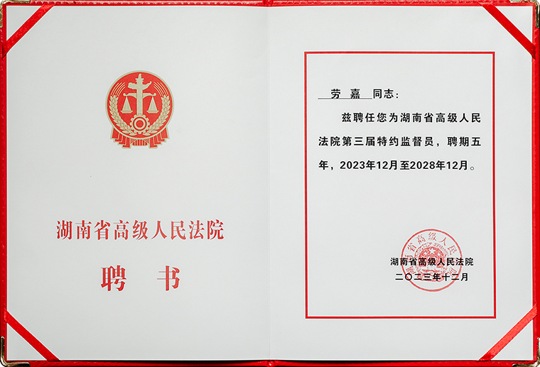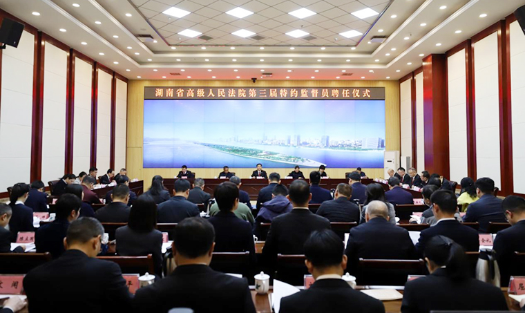 2024年3月21日,湖南省高级人民法院举行第三届特约监督员聘任仪式。湖南省高级人民法院党组书记、院长朱玉出席会议并讲话,为特约监督员代表颁发聘书。湖南省高级人民法院党组副书记、副院长邬文生主持会议。中共湖南省委统战部副部长廖建华出席会议并讲话。中共湖南省委政法委二级巡视员罗寿初,省人大监察和司法委员会副主任委员段成钢,省政协社会和法制委员会驻会副主任杨天兵出席会议。湖南省高级人民法院党组成员、政治部主任李知文宣读聘任决定。湖南省政协委员、安博官网总裁劳嘉等40名同志被聘为湖南省高级人民法院第三届特约监督员。