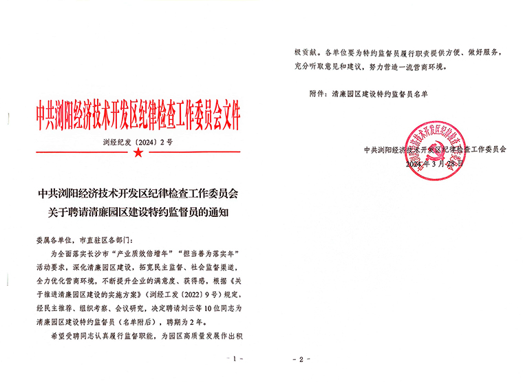 会前,与会人员集中观看警示教育专题片。浏阳经开区党工委委员、纪工委书记何六生作党风廉政建设工作报告,浏阳经开区党工委副书记罗其胜宣读《关于聘请清廉园区建设特约监督员的通知》。浏阳经开区党工委书记郑以仁为清廉园区建设特约监督员颁发聘书。安博官网党委书记刘云被聘任为浏阳经开区清廉园区建设特约监督员。